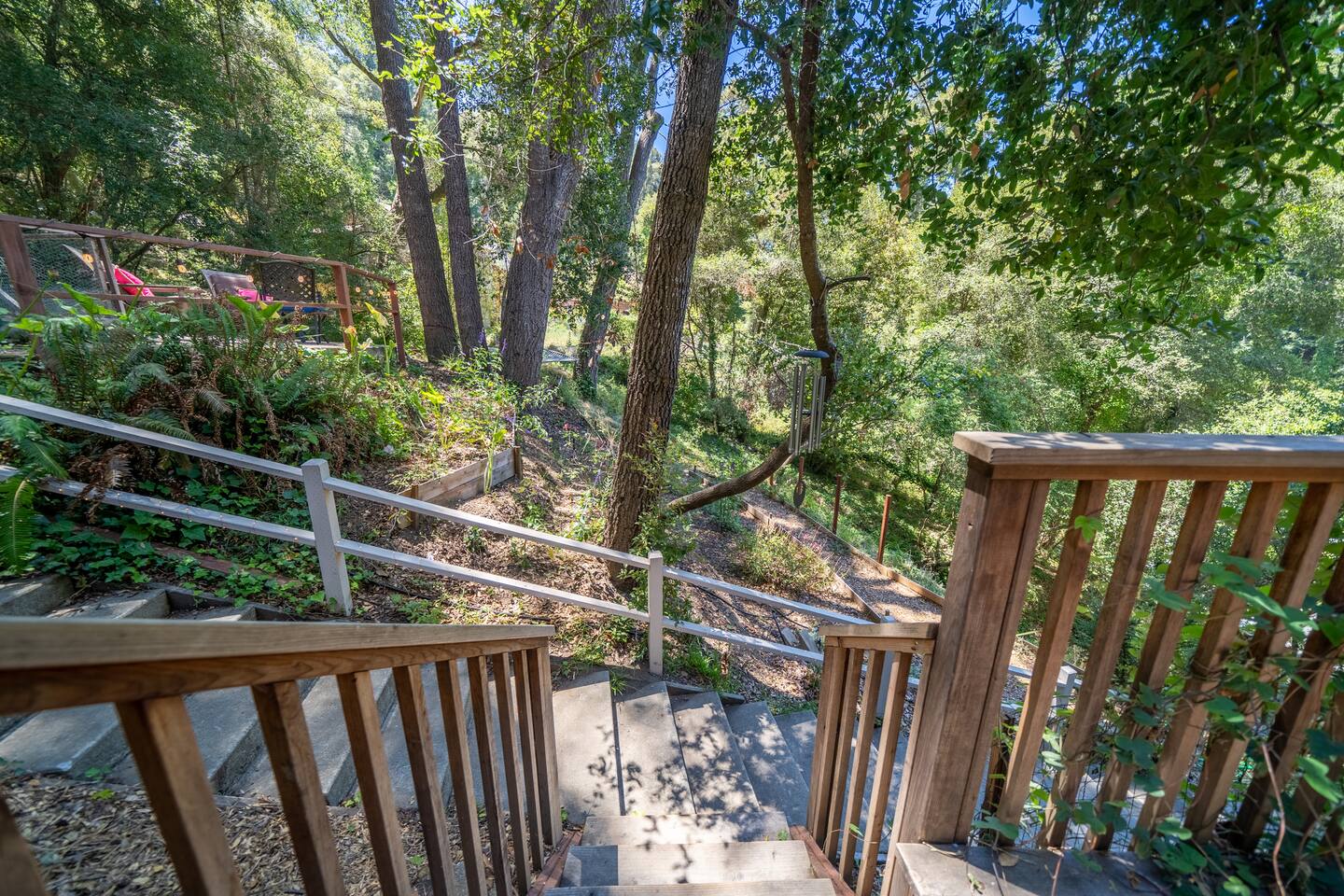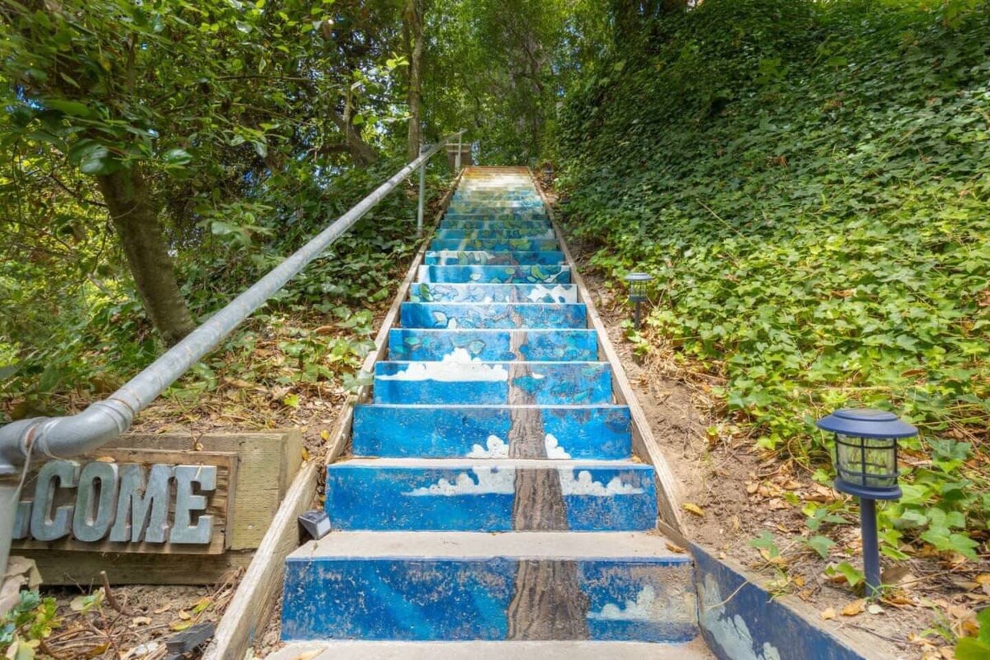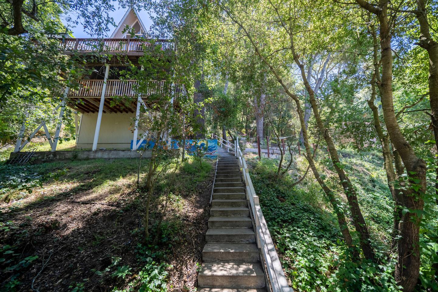 The long stairway leading up to the home is not for the faint of heart! It may seem a little daunting upon first arrival but once you see the beautiful views this elevation provides, you won't regret it. ⭐️ Follow us for info and announcements☀️ @stairwaytotreetopheaven - 1 bedroom with queen bed - 1 full bathroom (shower) - Living area with comfortable sofa and smart TV - Efficiency kitchen with all of the essentials - Private deck and patio area with hot tub! - One small dog permitted. This is the lower of two units in the house. They are separated, but connected by a locking stairwell, and can be booked together by request. We do our best to enforce quiet hours in both units (9pm - 8 am); however, at times the footsteps and noise from the upper unit can be heard in the lower unit. Free parking in the shared parking area down below the house. Two cars maximum parked in a row (i.e. if your party brings two vehicles, one car must be parked in front of the other). Limited additional street parking available near the parking area on a first come, first serve basis. Note: - There is no dishwasher - Ring technology is present to monitor the exterior entrances of the home - No parties allowed; no additional guests permitted. - One small dog permitted - Steep stairs make the property unsafe for small children or those with movement challenges