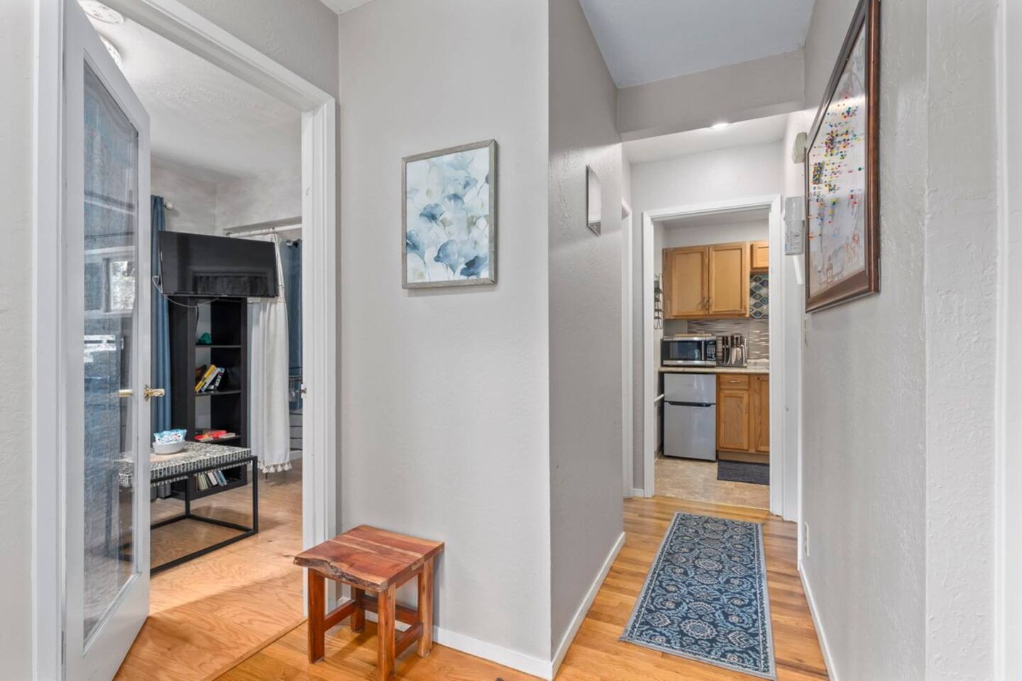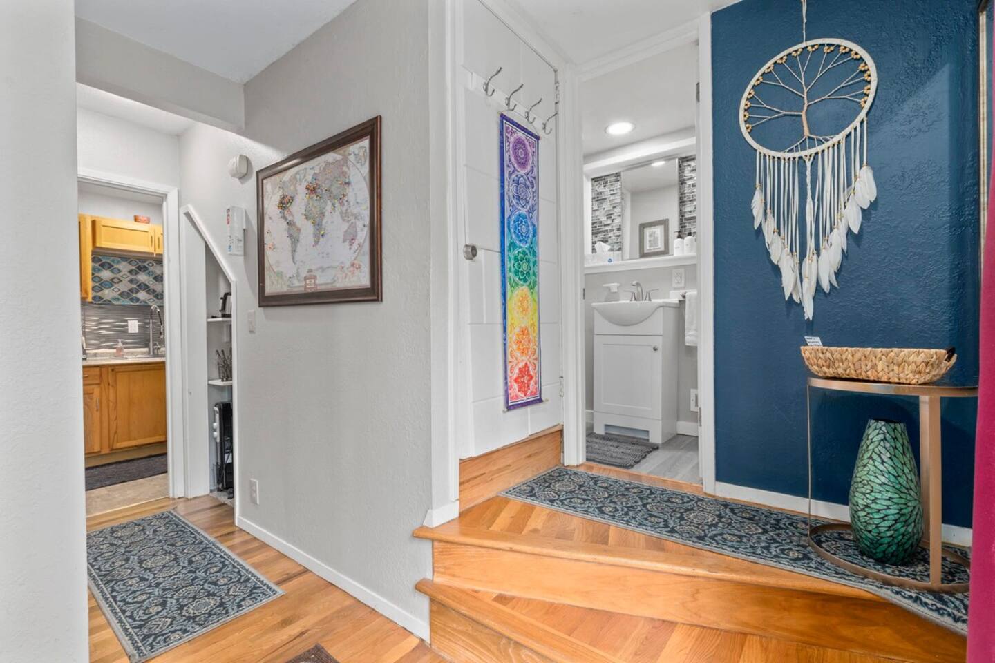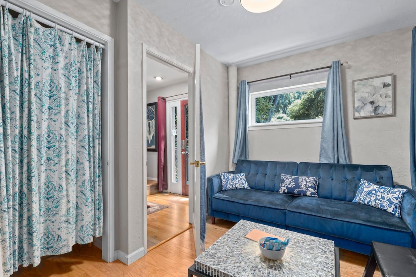 The long stairway leading up to the home is not for the faint of heart! It may seem a little daunting upon first arrival but once you see the beautiful views this elevation provides, you won't regret it. ⭐️ Follow us for info and announcements☀️ @stairwaytotreetopheaven - 1 bedroom with queen bed - 1 full bathroom (shower) - Living area with comfortable sofa and smart TV - Efficiency kitchen with all of the essentials - Private deck and patio area with hot tub! - One small dog permitted. This is the lower of two units in the house. They are separated, but connected by a locking stairwell, and can be booked together by request. We do our best to enforce quiet hours in both units (9pm - 8 am); however, at times the footsteps and noise from the upper unit can be heard in the lower unit. Free parking in the shared parking area down below the house. Two cars maximum parked in a row (i.e. if your party brings two vehicles, one car must be parked in front of the other). Limited additional street parking available near the parking area on a first come, first serve basis. Note: - There is no dishwasher - Ring technology is present to monitor the exterior entrances of the home - No parties allowed; no additional guests permitted. - One small dog permitted - Steep stairs make the property unsafe for small children or those with movement challenges