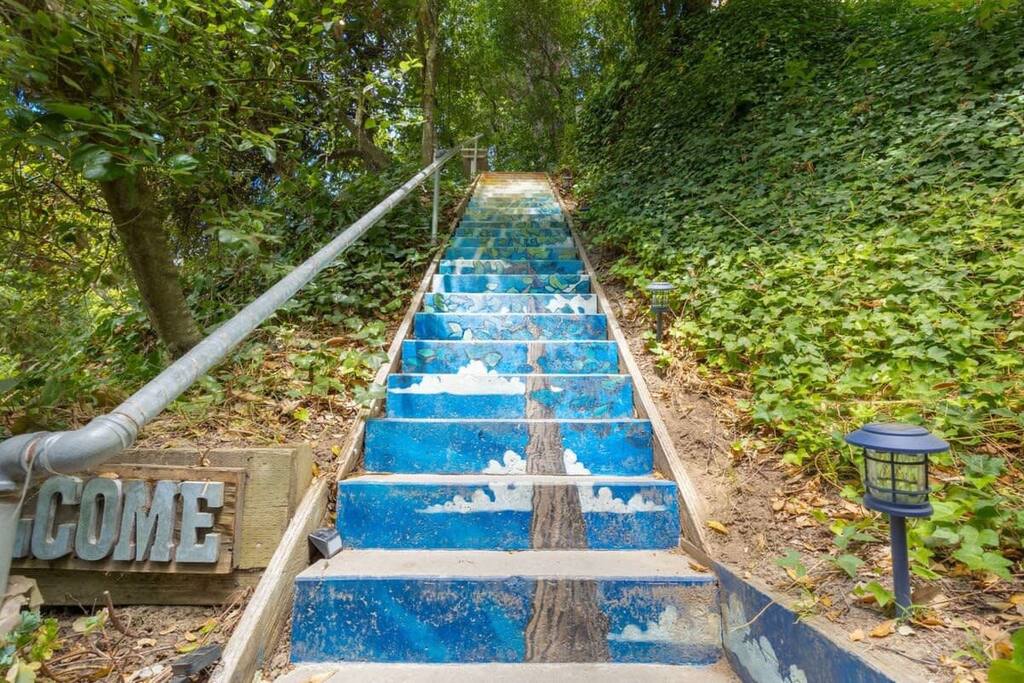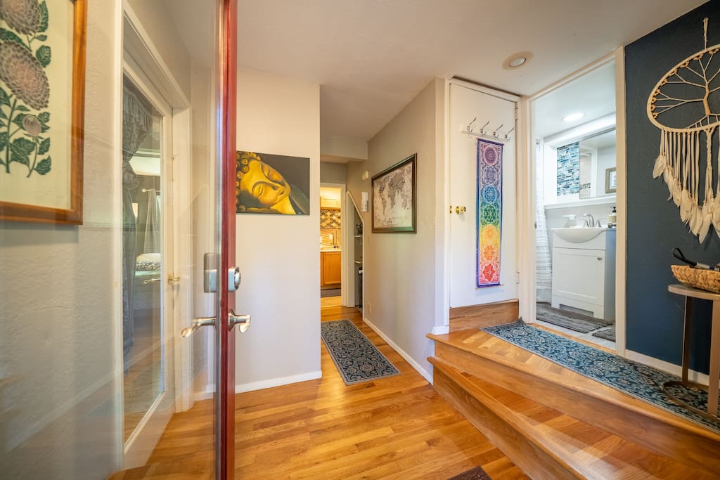 The long stairway leading up to the home is not for the faint of heart! It may seem a little daunting upon first arrival but once you see the beautiful views this elevation provides, you won't regret it. - 1 bedroom with queen bed - 1 full bathroom (shower) - Living area with comfortable sofa and smart TV - Efficiency kitchen with all of the essentials - Private deck and patio area with hot tub! This is the lower of two units in the house. They are separated, but connected by a locking stairwell, and can be booked together by request. We do our best to enforce quiet hours in both units (9pm - 8 am); however, at times the footsteps and noise from the upper unit can be heard in the lower unit. Free parking in the shared parking area down below the house. Two cars maximum parked in a row (i.e. if your party brings two vehicles, one car must be parked in front of the other). Limited additional street parking available near the parking area on a first come, first serve basis. Note: - There is no dishwasher - Ring technology is present to monitor the exterior entrances of the home - No parties allowed; no additional guests permitted. - One small dog permitted - Steep stairs make the property unsafe for small children or those with movement challenges