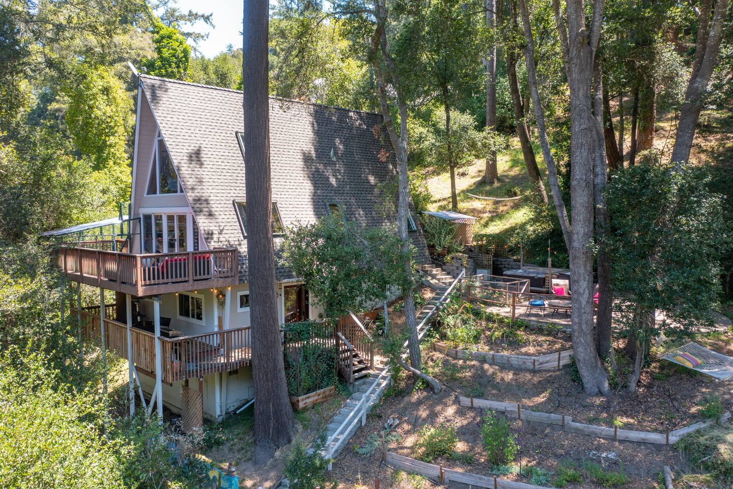 1 bedroom, 1 bath studio unit in a beautiful A-Frame in the trees of Aptos, CA (Permit 221336). This is the lower of two units in the house and features an efficiency kitchen, a full bathroom, a private deck with hot tub, bedroom, and living room area. Walk to coffee, grocery stores, local wine tasting, amazing hikes, and restaurants. There is free parking at the base of the hill for up to two cars parked in a row.