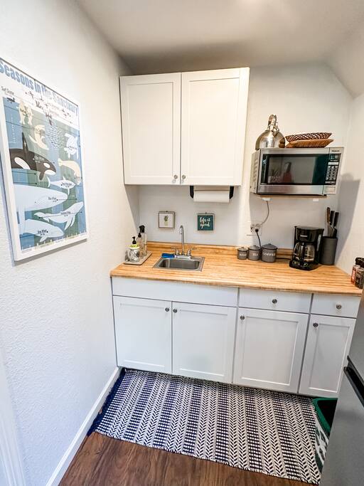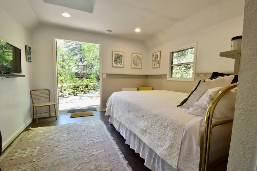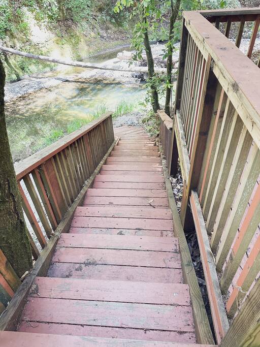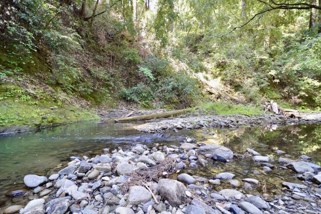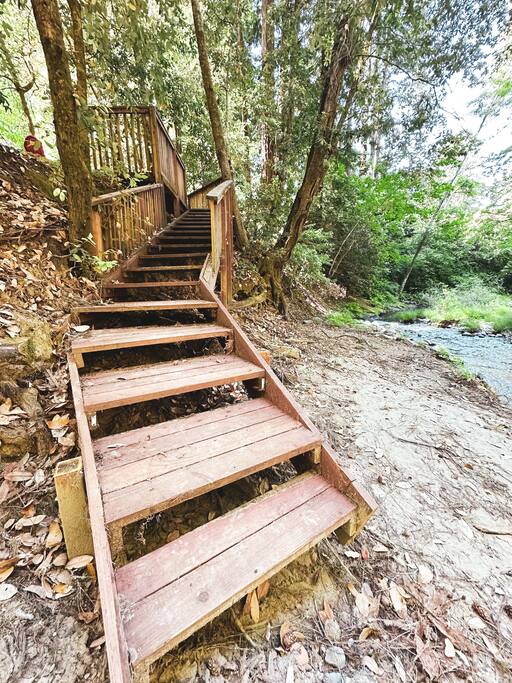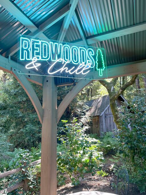 The cabin, which is nestled under the coastal redwoods, features a comfortable queen bed, a bathroom with a hot shower, and a compact kitchenette for your convenience. There is a small fold-up desk and strong wifi should you need to work remotely during your stay. Step outside and discover multiple lounge areas where you can unwind amidst nature's embrace or fire up the BBQ for a delightful outdoor dining experience. There is a hot tub under a gazebo as well! Cabin guests enjoy access to a private creek behind the cabin. One parking spot is available for guest use. If additional parking is needed, please inquire. The property is shared with a primary home and separated by a gate. The cabin is set back behind the primary home. The cabin’s outdoor space abuts the primary home’s backyard and is separated by a fence and plants. You can see into the primary home backyard. You may be able to hear the primary home occupants if they’re outside as well. But the real highlight of your stay? Our private section of the creek, where you can dip your toes, bask in the sun, or simply savor the soothing sounds of flowing water.